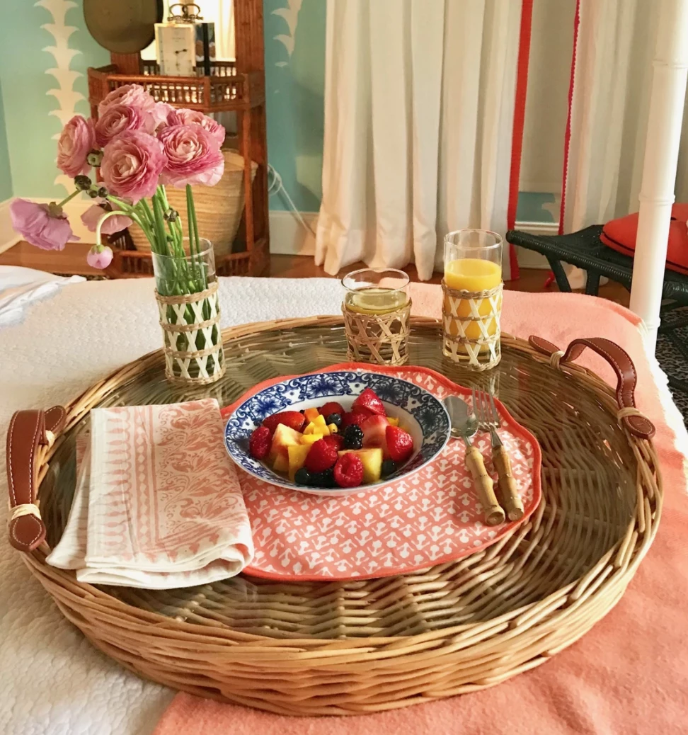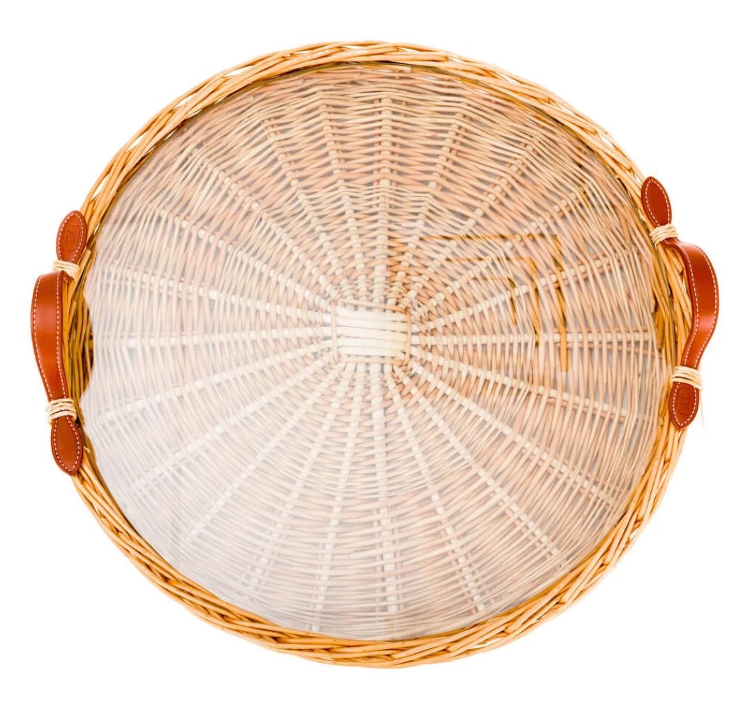 Amanda Lindroth’s Signature Island Tray made from natural willow with fine leather handles & a fitted tempered glass insert. Unique round shape.