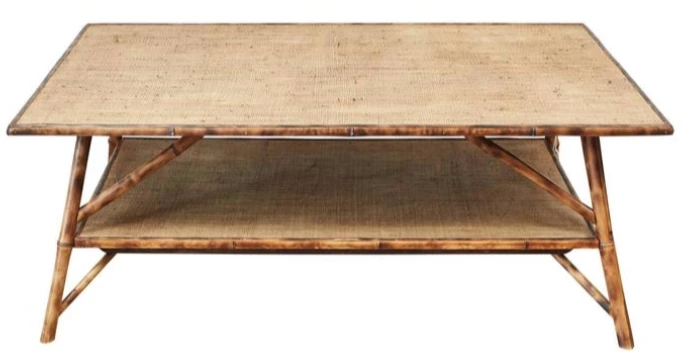 This tiger bamboo coffee table is a custom design made in a Los Angeles workshop. Not normally found as an antique, this table was produced for for todays settings. The top has a caned surface along with the useful shelf below. Custom sizes available.Â