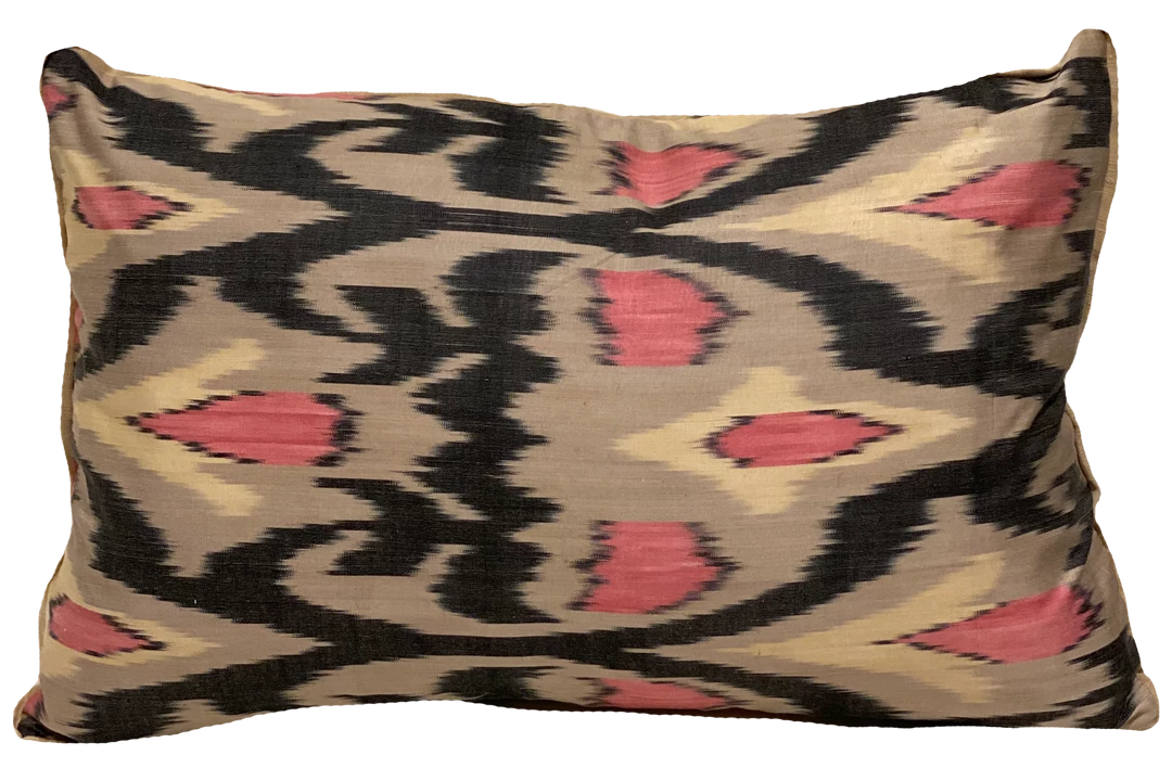 This luxurious pillow is handmade using silk ikat. Our ikats are handwoven by highly skilled artisan weavers in Uzbekistan using ancient techniques. Piped in taupe linen. We recommend a WMH premium down feather insert that is 1″ larger than the pillow cover.
