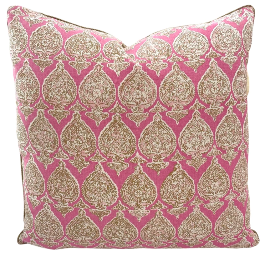 Raoul Textiles is a family-owned design firm based in Santa Barbara, California. Renowned for its vibrant sense of color and innovative, unexpected approach to design. This fabric is hand-printed on the finest Belgian linen; every step of the process is done by hand. We recommend purchasing our WMH Premium Feather Down insert that is 1″ larger than the cover.