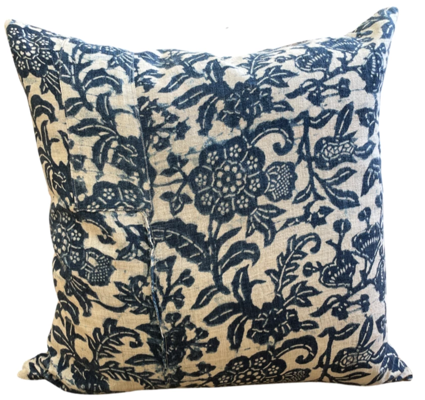 This vintage textile is batiked in a beautiful indigo blue. Hand-stitching and small patches add character to these pillows.