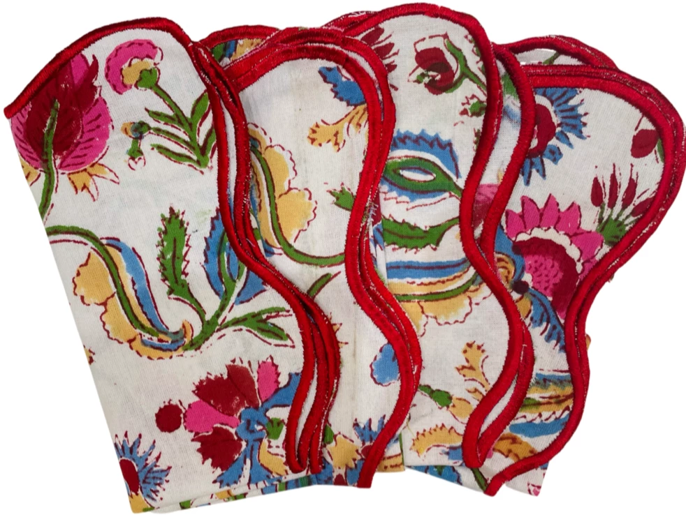 Casual and fun,Ā our Multi Floral VineĀ napkins have been hand printedĀ by artisans in India. Embroidered scallop edge.